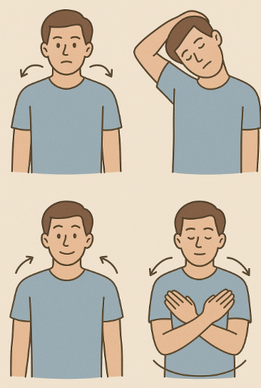 - 측면 목 스트레칭: 의자에 앉아 오른손으로 왼쪽 머리를 잡고 천천히 오른쪽으로 당깁니다. 반대쪽도 같은 방식으로 반복합니다.
