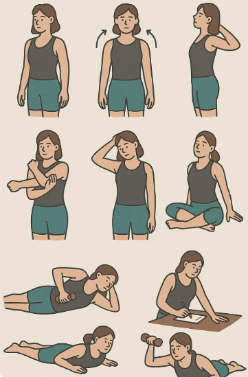 또한 벽 밀기 자세 유지(Wall Press Hold)는 정적인 형태로 어깨 안정화에 큰 도움을 줍니다. 등을 벽에 대고 팔을 'L자' 형태로 만들어 벽을 강하게 누르며 자세를 유지합니다. 이 동작은 어깨 주변 근육에 균형 있는 자극을 주며, 좌우 대칭 유지를 돕습니다.